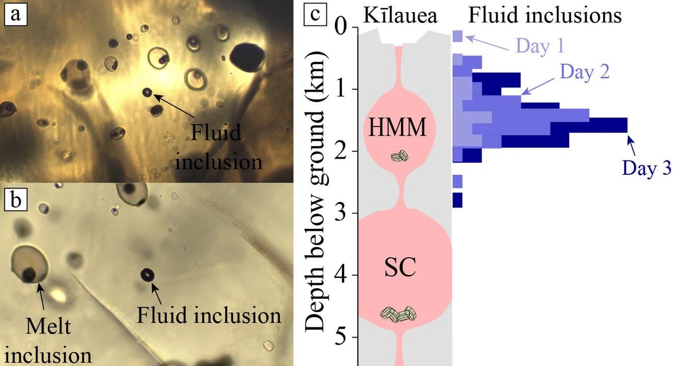 Photomicrographs of fluid inclusions trapped inside olivine crystals present in rock samples collected on September 10th, 2023, during a summit eruption of Kīlauea (a-b, on left). Data from these fluid inclusions, collected over three days, reveal that the magmas resided in the shallow Halemaʻumaʻu (HMM) chamber before erupting; the deeper South Caldera magma chamber (SC) is also shown (c, on right).