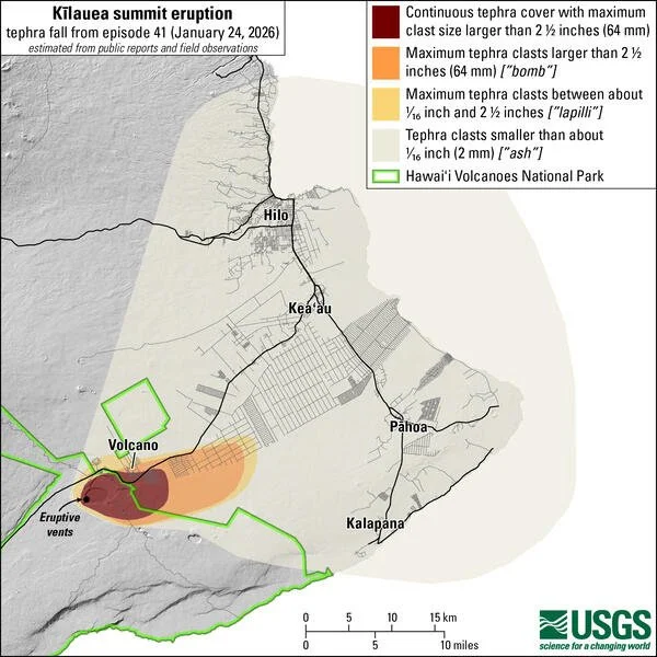 This map shows the tephra fall associated with episode 41 of Kīlauea's episodic summit eruption, on January 24, 2026. Tephra is a generic word for any material erupted by a volcano that travels through the air before landing on the ground. During episode 41 on January 24, lava fountains from the north and south vents in Halemaʻumaʻu at the summit of Kīlauea reached up at least 450 m (1475 feet). Weak surface winds in combination with stronger upper-level winds blowing to the east and north resulted in widespread tephra fall in communities to the northeast and east within the Districts of Kaʻū, Puna, and South Hilo.